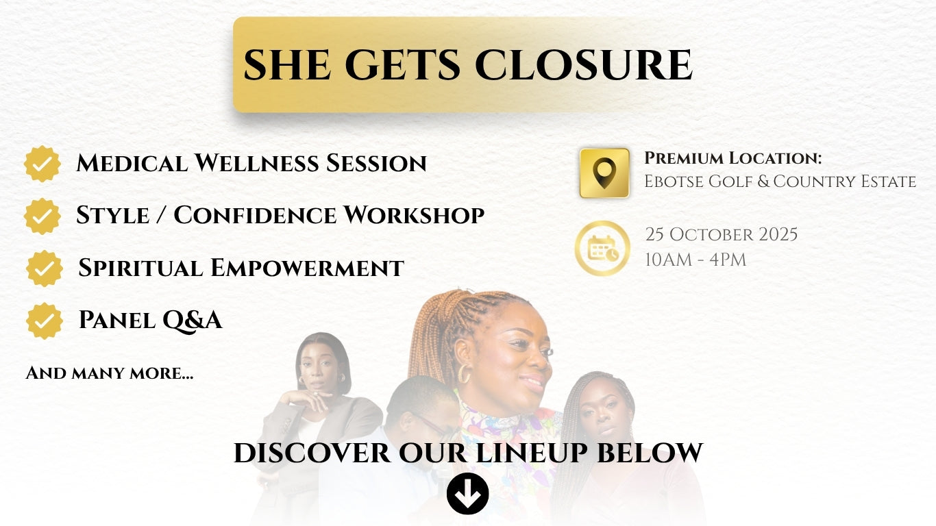 At She Gets Closure, Dr. Diobe will guide women in closing uncertainty around their health. His session delivers clear, actionable medical know-how designed to remove fear and replace it with understanding, so every woman can take ownership of her wellbeing with confidence. A born-again believer and dynamic speaker, Dr. Diobe doesn’t just educate — he equips.